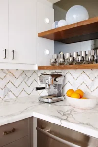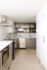 This kitchen gets a ‘custom’ look by combining cabinet door styles – white for the uppers, grey for the lowers – and the addition of high end finishes like marble countertops, mirror-backed open shelving and dramatic ceiling height chevron tiling make this kitchen really stand out.