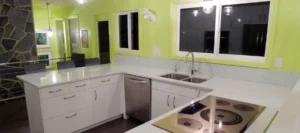 Certainly a bold choice, but the bright colour worked with their all white, IKEA ABSTRAKT cabinetry, quartz counters and the mid-century vibe of their home. We love that they took a risk by painting their kitchen such a vibrant colour.Today on Design Sponge they are talking about lime green walls and we can’t help but think our clients Shelley & Kelly’s kitchen should have made the list too for their bold, fashion-forward kitchen paint choice.
