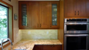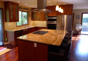 Small, closed in and separate from the dining room, Suzanne and Keith needed their kitchen to be a place where they could cook and entertain friends simultaneously. Working with IKAN they chose IKEA’s ADEL cabinets, a near perfect match to the natural wood trim around their house. They installed an incredible island with a gas cooktop and a stunning (and massive!) slab of granite from BG Granite, giving them ample space to create delicious meals while their guests sit counter side with a glass of wine.